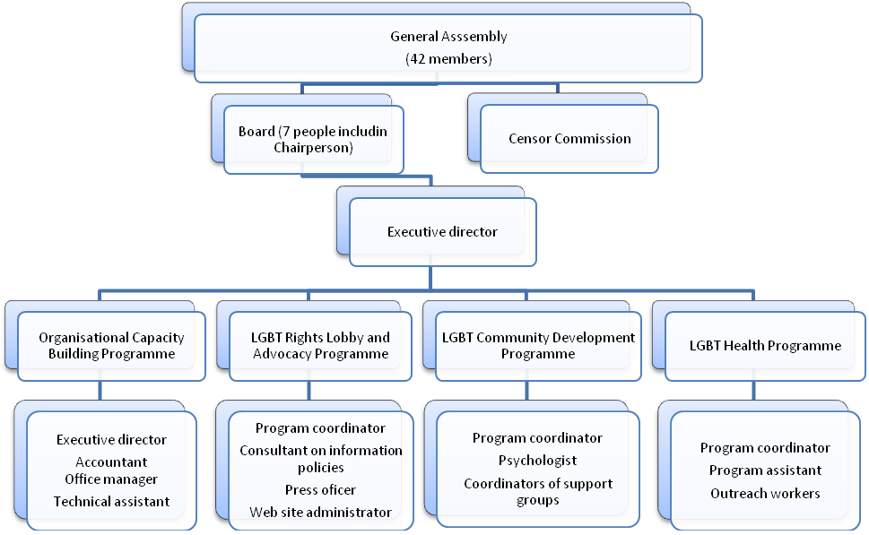 The GENDERDOC-M Centre is a democratic membership-based organisation. The annual assembly of its members is the main decision-making body. The assembly accepts new members, endorses the general direction of organisation’s activities and yearly financial reports and elects the seven-member Board and its Chairperson. The Board in the person of its Chair directs the organisation between the general assembly meetings. The Senate approves organisational strategies designed by the staff and maintains the overall control over organisation’s finances, as well as it appoints the Executive Director. The Executive Director is engaged in the ongoing management of organisation: financial management, implementation of the organisation’s strategic directions of activity, recruitment and dismissal of employees and the current planning.