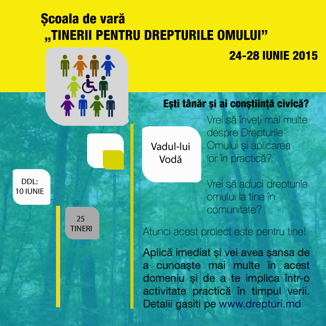 Asociația Obștească „Centrul de Informare în domeniul Drepturilor Omului” (CIDO) în parteneriat cu Youth Resource Center on Human Rights (CODAP) anunță concurs de selectare a participanților/participantelor pentru a doua etapă a programului „TINERII PENTRU DREPTURILE OMULUI”. Școala de vară va avea loc între 24 și 28 iunie 2015 în localitatea Vadul-lui-Vodă.