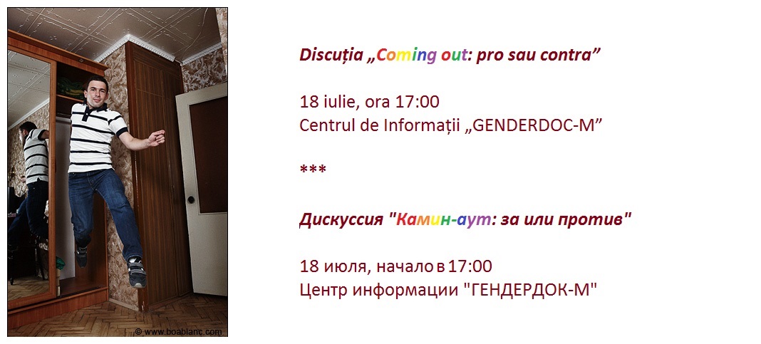Centrul de Informații „GENDERDOC-M” te invită sâmbătă, 18 iulie, la sediul organizației la ședința clubului de discuții cu genericul „Coming out*: pro sau contra”. Vom discuta subiectul coming out-ul ca atare și vom încerca să răspundem împreună la întrebarea dacă trebuie sau nu să facem coming out față de cei din jur. Dacă da, atunci când, dar dacă nu, atunci de ce („mai puține știu – mai bine dorm”)?