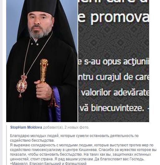 - Mulțumesc tinerii care au fost în măsură să oprească activitățile de promovare a nerușinării. Îmi exprim solidaritatea cu tinerii care se opun măsurilor de promovare a homosexualității în centrul Chișinăului. Vă mulțumesc pentru curajul de care ați dat dovadă pentru a opri nerușinarea. Țara stă pe așa oameni ca voi, apărători ai adevăratelor valori. Mă bucur de succesele voastre. Fiți binecuvântați – se spune în mesajul de mulțumire cu semnătura: Markel, Episcop de Bălți și Fălești.