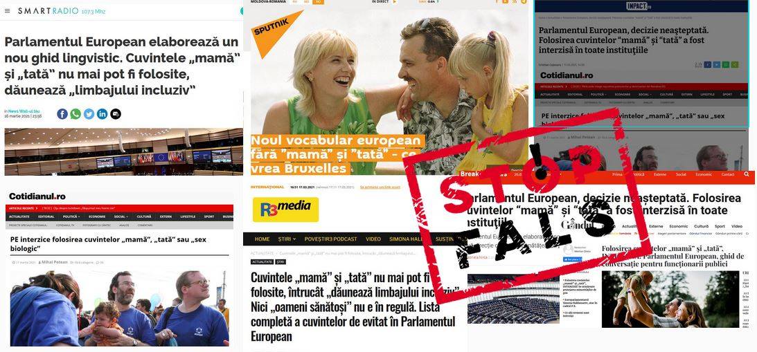Pe 16 martie, portalul cu politică editorială pro-Kremlin Sputnik.md a publicat articolul Noul vocabular european fără „mamă” și „tată” - ce vrea Bruxelles”. Cu trimitere la cotidianul italian Il Giornale, în text se menționează că: „Parlamentul European a elaborat un nou ghid lingvistic, destinat politicienilor și oficialilor și care să fie pe placul homosexualilor”. Cotidianul italian, citat de Sputnik.md, scrie că „Simona Baldassarre, europarlamentar din partea partidului populist Liga condus de Mateo Salvini, a denunțat indicațiile unui nou vocabular pro-homosexuali propus de Parlamentul European. Potrivit acestui nou vocabular, ar fi interzis să folosești termeni ca „mamă”, „tată”, „trans”, „gay” sau „lesbiană”, pe motiv că acești termeni ar fi lipsiți de respect pentru anumite minorități etnice sau de gen (LGBT)”. (...) În același sens, cuvintele „mamă” și „tată” nu ar mai fi potrivite, ci termenul generic de „părinți”, se spune în articol.