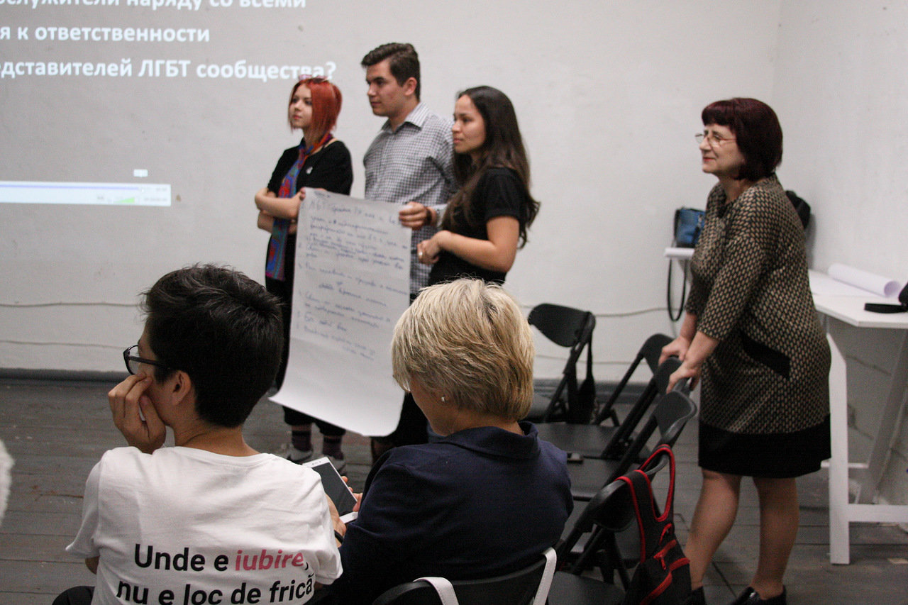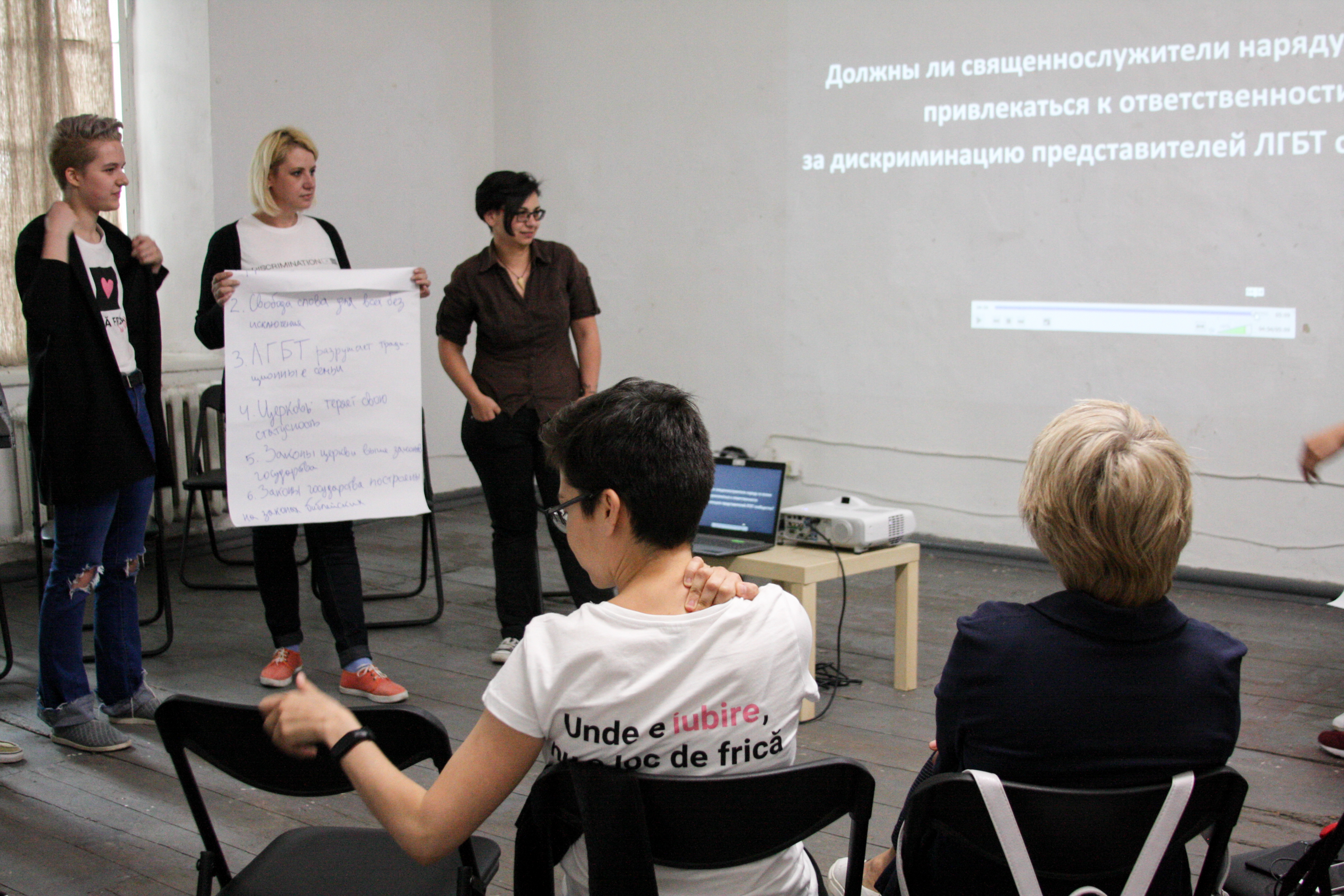 marșurile comunității LGBT în Moldova și despre nevoia de a responsabiliza clerul pentru jignirea reprezentanților comunității LGBT. Subiectele video prezentau opinii și argumente contradictorii. Ulterior participanții, persoane de diferite vârste, identități de gen și orientări sexuale, au fost rugați să se împartă în două grupuri și să încerce să apere una dintre pozițiile opuse prezentate în video, indiferent dacă sunt sau nu de acord cu ea.