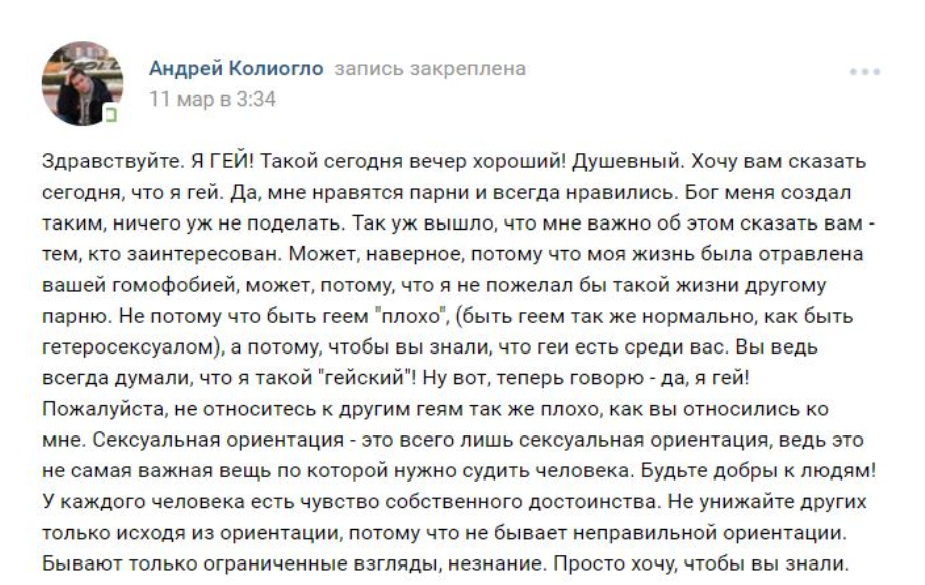 „Salut. Sunt gay! Vreau să vă spun că sunt gay. Da, îmi plac băieții și întotdeauna mi-au plăcut. Dumnezeu m-a creat așa și nu pot nimic schimba.” Așa și-a început, Andrei Colioglo, tânărul din Găgăuzia, mesajul publicat pe pagina sa de pe VK.