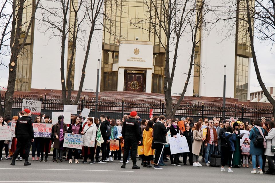 În fața Președinției organizatorii au oprit marșul pentru a citi din cărțile poștale expediate femeilor cu ocazia zilei de 8 martie de către Președintele țării, Igor Dodon. Apoi participanții la marș au întors ilustratele Președintelui, aruncândui-le peste gardul instituției.