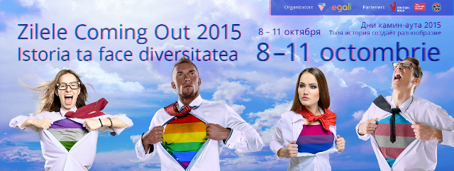 Centrul de Informații „GENDERDOC-M” te invită între 8 și 11 octombrie să participi la un șir de evenimente consacrate Zilei internaționale a coming out-ului*, care se marchează anual la 11 octombrie. Desfășurate sub sloganul „Istoria ta face diversitatea”, Zilele Coming Out 2015 îți oferă câteva activități ale căror scop este de a spori vizibilitatea lesbienelor, gay-ilor, bisexulilor și persoanelor transgen în societate și a sensibiliza publicul cu privire la viața, trăirile și exepriențele persoanelor din comunitatea LGBT din Republica Moldova.
