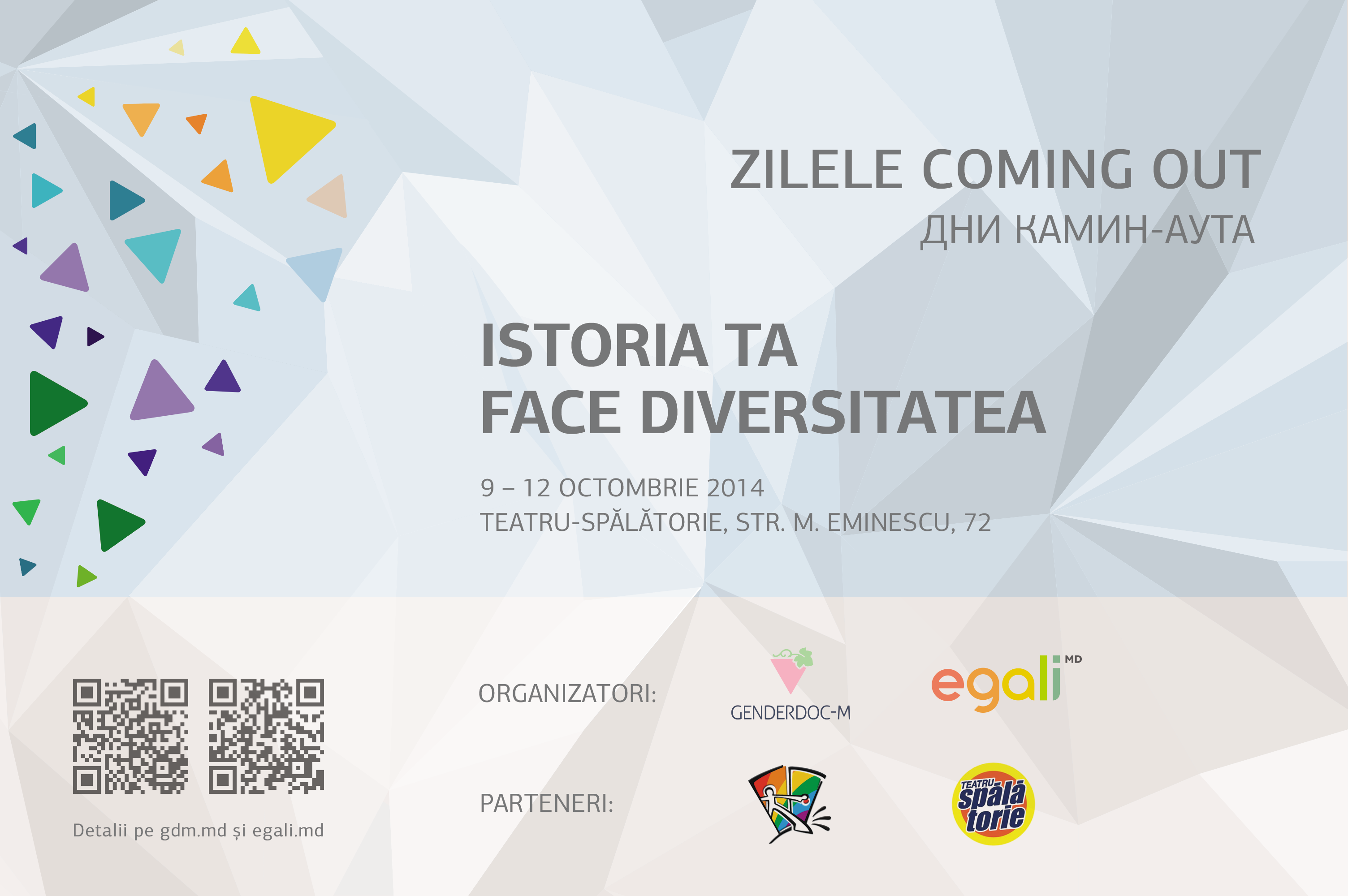 Centrul de Informații „GENDERDOC-M” te invită între 9 și 12 octombrie să participi la un șir de evenimente consacrate Zilei internaționale a coming out-ului*, care se marchează anual la 11 octombrie. Desfășurate sub două slogane concomitent „Istoria ta face diversitatea” și „Spune-ți istoria cu propriile cuvinte”, Zilele Coming Out 2014 îți oferă câteva activități ale căror scop este de a spori vizibilitatea persoanelor LGBT în societate și a sensibiliza publicul cu privire la viața, trăirile și exepriențele personale ale comunității LGBT din Republica Moldova.