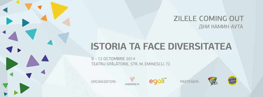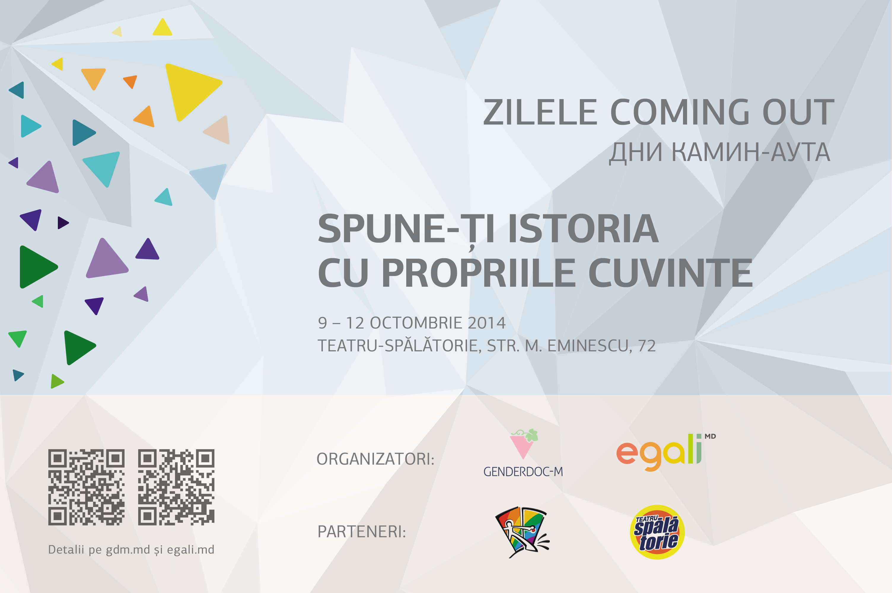 Центр информации «ГЕНДЕРДОК-М» приглашает вас 9 – 12 октября принять участие в мероприятиях, посвящённых Международному дню камин-аута*, который ежегодно отмечается 11 октября. Проходящие одновременно под двумя девизами «Расскажи свою историю собственными словами» и «Твоя история создаёт разнообразие» Дни камин-аута 2014 предлагают вам посетить несколько событий, целью которых является повышение видимости лесбиянок, геев, бисексуалов и тансгендеров в обществе, а также повышение его осведомлённости о жизни ЛГБТ в Молдове, их переживаниях и личном опыте.