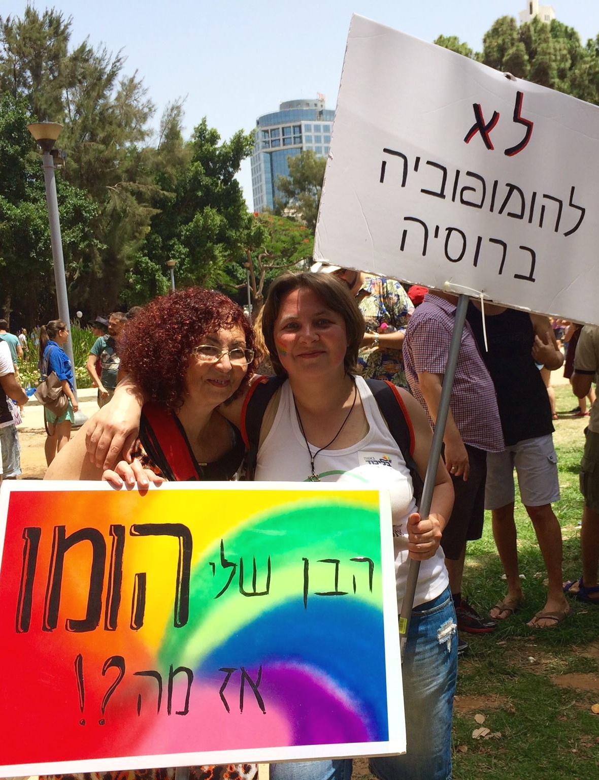 Абсолютно так. Мы сидели с Батьей в кафе, и она спросила меня, чего ты боишься? А я не могла ей объяснить. Просто боюсь и все. Я воспринимала это, как горе, произошедшее в моей семье. Не просто горе – трагедия. Тем не менее моя трансформация происходила очень быстро. С момента признания Шая и до моей поездки на тельавивский прайд прошло меньше месяца. Представляешь? И вот я взяла у женщин плакат, на котором было написано «Мой сын гей. Ну и что?» И решила просто пойти посмотреть, что творится вокруг. Очень странное было ощущение: у меня горе, у меня трагедия, а вокруг праздник: все веселятся, все улыбаются, все невероятно доброжелательны. И тут все обращают внимание на мой плакат, и ко мне начинают идти толпами люди разных возрастов, даже совсем пожилые, гораздо старше меня. Меня начинают обнимать-целовать, а я не понимаю: какие-то посторонние люди, что они от меня хотят. Многие стали мне рассказывать о том, как их не принимали в семье, как их выгоняли из дома. Один парень из ультраортодоксальной семьи рассказал, как родные сидели по нем «шиву», будто он умер. И вот тогда, наверное, у меня в голове перемкнуло.