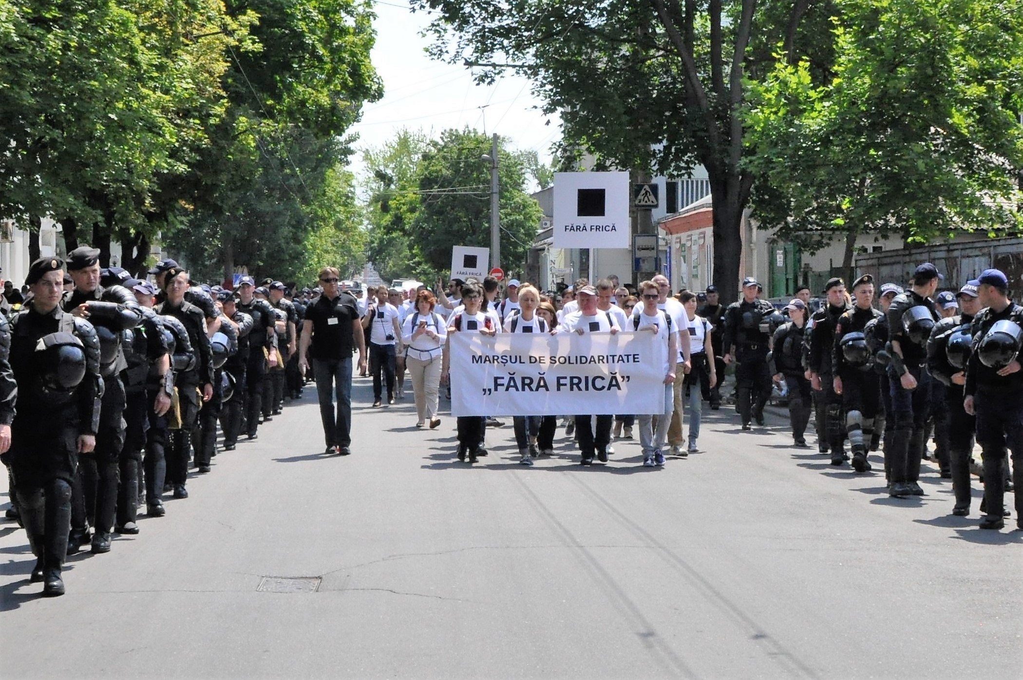 Если я не ошибаюсь, новым местом проведения марша стала улица Букурешть. Мы поднялись на два квартала от центральной улицы и повернули направо. Каково же было наше удивление, когда мы увидели колонну полицейских в полном обмундировании (видимо, спецназ – ред.) шедшую нам навстречу, и другую такую же, одетую уже по форме. Было ощущение, что они не шли, а текли рекой. Это было очень странное ощущение, идти, пробираясь через колонну полиции.