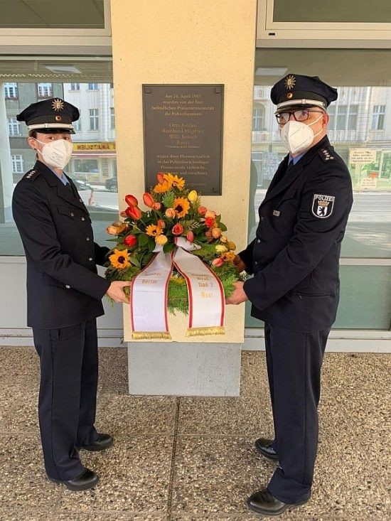 Анне фон Кноблаух и Себастьян Штипп, два представителя берлинской полиции по делам ЛГБТИ-сообщества, возложили на церемонии открытия венок к мемориальной доске.