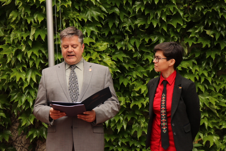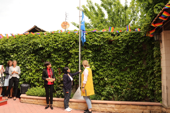 Праздник начался с торжественного, уже ставшего традиционным, поднятия флага Прайда. В этом году почетное право водрузить флаг было предоставлено Елене Митьевой, одной из первых сотрудниц Центра информации ГЕНДЕРДОК-М, и Татьяне Кебак, недавно избранной на должность председателя Сената организации.