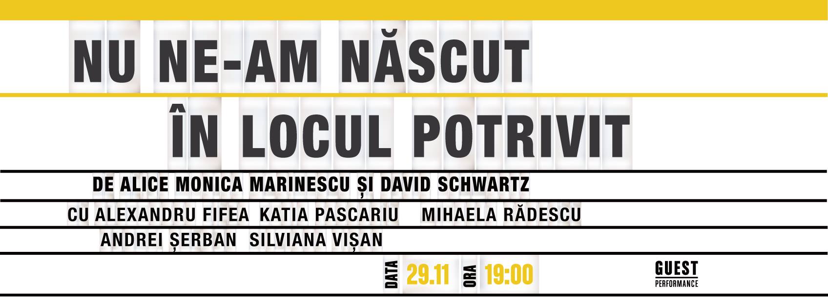teatru-spălătorie is pleased to invite you on Tuesday, 29 noiembrie, 19:00h, to the performance BORN IN THE WRONG PLACE, written and directed by: Alice Monica Marinescu and David Schwartz with: Alexandru Fifea, Katia Pascariu, Mihaela Rădescu, Andrei Șerban, Silviana Vișan