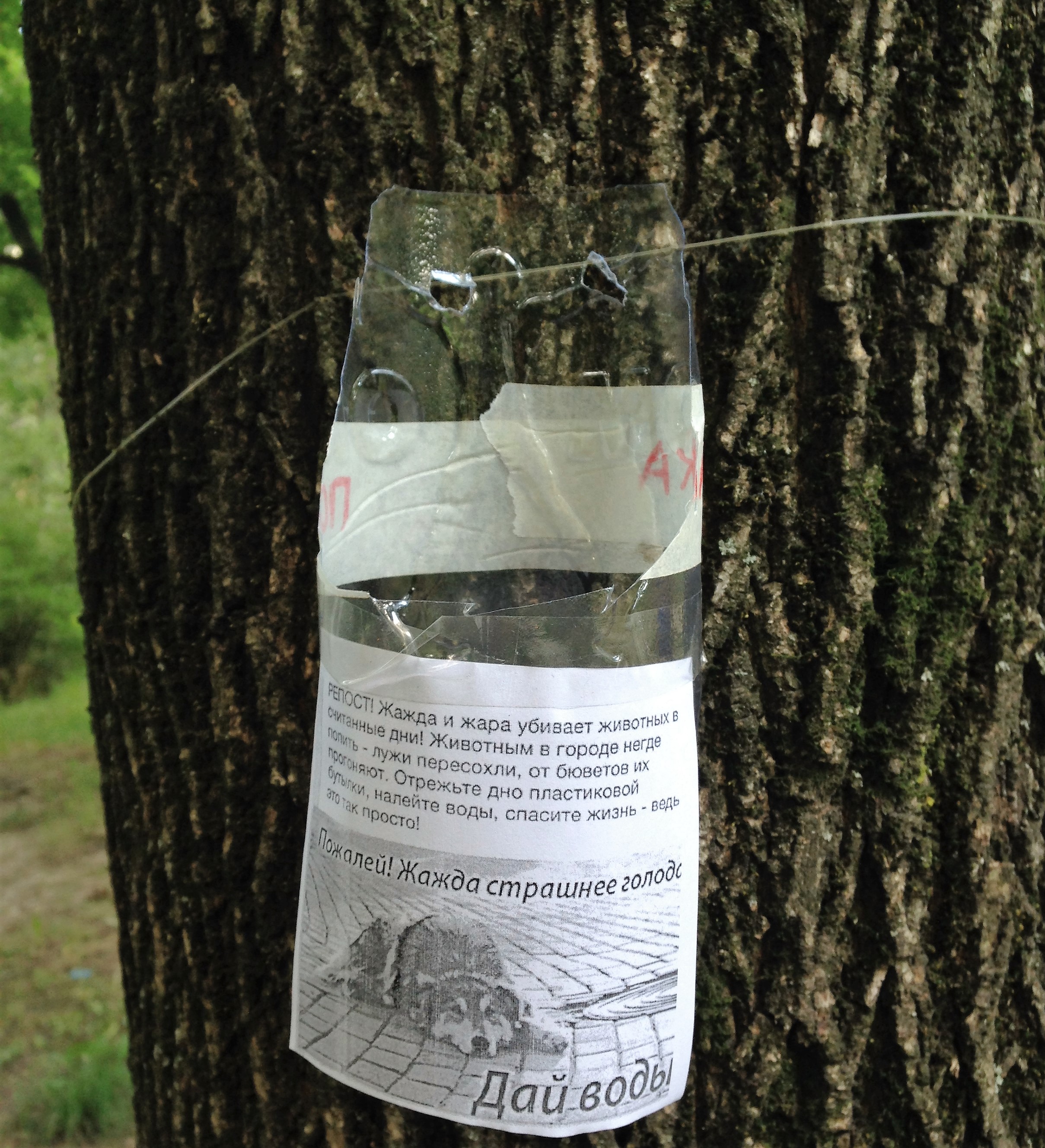 „Nu a fost complicat deloc, am adus fiecare sticle din plastic de la 3 până la 6 itri, pe care le-am tăiat în jumătate, astfel încât să păstrăm un volum cât mai mare, dar în același timp animalelor să le fie comod să bea din ele. O parte a sticlei am lăsat-o mai lungă, pentru a face găuri în ea și a lega vasul de copac cu ajutoul unei sfori, pentru ca vântul să nu poată lua vasele golite”, a explicat Galina Murzin coordonatoare de voluntari la GENDERDOC-M.
