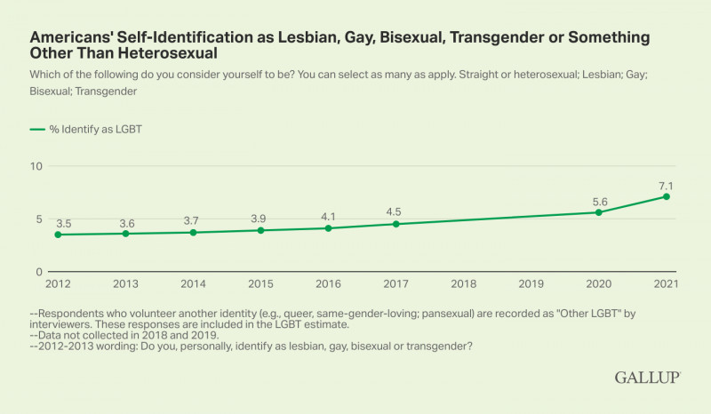 Acest sondaj a fost realizat pentru prima dată în 2012, iar procentul de persoane care s-au identificat drept LGBT a fost de 3,5%. De atunci a crescut constant.