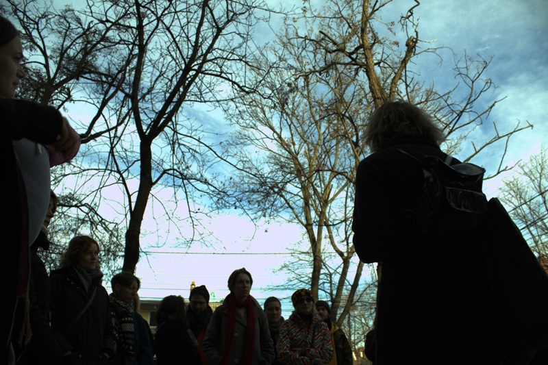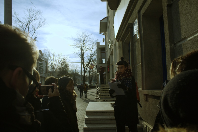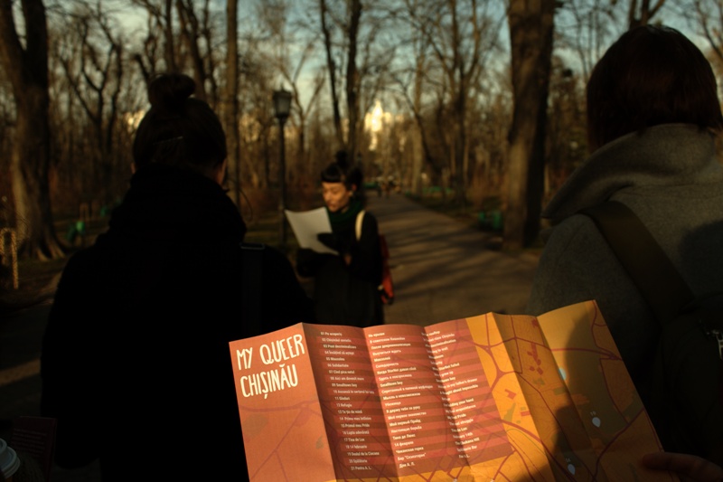 E un început de decembrie plictisitor de gri. Din acest motiv participanții la turul queer al orașului Chișinău par să formeze o oază de culoare la intrarea în Grădina Publică din centrul orașului, acolo unde începe traseul. Vestimentația de culori aprinse este absolut neobișnuită pentru oraș în această perioadă a anului, în schimb ordinară pentru persoanele queer în orice colț al lumii, chiar și în orașele sure. Intrușii atrag imediat priviri și întrebări. Organizatorii se abat periodic de la textele ghidului, tipărite pe foi A4, pentru a satisface curiozitatea trecătorilor.