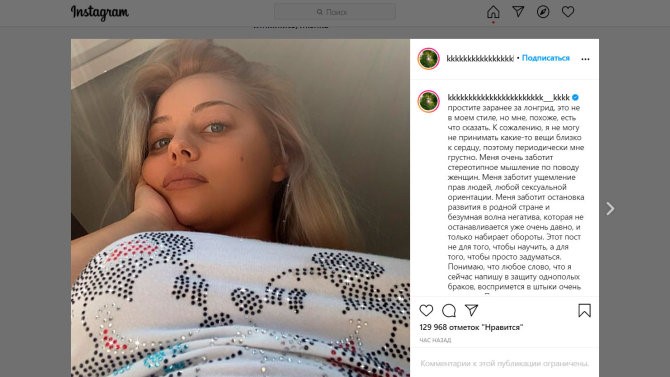 «Понимаю, что любое слово, что я сейчас напишу в защиту однополых браков, воспримется в штыки очень многими. Понимаю, что все что я напишу по поводу женщин и наших прав, подкрепится моей фотографией в трусах, что лично для меня всегда было удивительно. Понимаю, что, если я напишу слово "трансгендер", многие убегут с моей страницы с криками. И я бы хотела, чтобы вы действительно ушли, если вам доставляет дискомфорт мое лицо, мой способ самовыражения и мои мысли. Я так же собираюсь поддерживать свою аудиторию, так же собираюсь мотивировать себя и своих фолловеров на большие свершения. Я выражаю огромную благодарность за поддержку!» - пишет Катя Кищук и добавляет: «Идите исключительно за своей мечтой и делайте это так, как считаете нужным. Чем больше внимания вы обращаете на то, что говорят вам люди, тем более длительная остановка ждет вас на вашем пути. Моя длилась слишком долго, потому что я перестала получать удовольствие от того, что я делаю, и для меня стал важен не процесс, а успех. Не совершайте моих ошибок и будьте свободными».