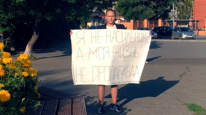 Огнев вышел на пикет, потому что кольцо ненависти вокруг ЛГБТ-людей в России сжимается. Пикетчик решил поддержать двух парней из Москвы, арестованных судом после того, как они якобы занимались сексом при открытом окне, и все это увидел несовершеннолетний подросток.